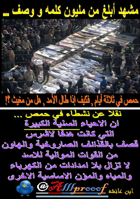 عائلات بالكامل يقضى عليها بالكامل كل يوم في حمص ذبحا بالسكاكين والاحراق بالنار.. والجيش الحر بصدور عاريه يدافعون عن ماتبقى لايملكون الا البنادق والرشاشات فقط