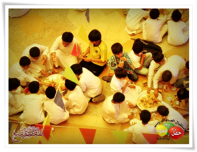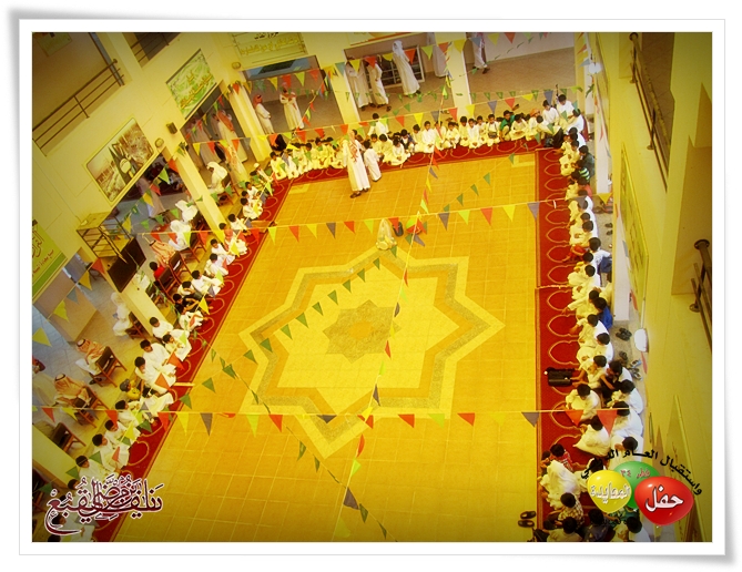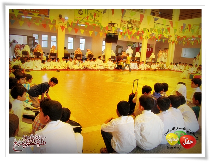 كان موعد لن ينساه طلابنا حيث حفل المعايدة واستقبال الـــعام الدراسي الجديد بدء بالقرآن الكريم ثم كلمة لمدير المدرسة الأستاذ الفاضل خـــالد بن عبد الرحمن الخريف بعدهـا قام طلاب المدرسة بالسلام على معلميهم في جوء أسري وتربوي رائع لينطلق البرنامج الثقافي والألعاب الحركية والمسابقات الذهنية واستمع طلابنا إلى حناجر ذهبية صدعت بأعذب الأناشيد والقصائد ثم تناول أبناءنا وجبة الغداء التي أعدتها المدرسة ليستلم أبنائنا الكتب الدراسية والجدول الدراسي.