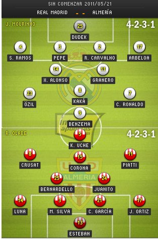 نشرت صحيفة الماركا الاسباني التشكيلة المتوقعة لمباراة الريال مدريد والميريا في المباراة الأخيرة من الدوري الاسباني في اطار الجولة 38 من الدوري الاسباني لموسم 2010 - 2011 واليكم التشكلية المتوقعة